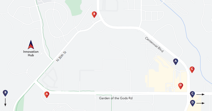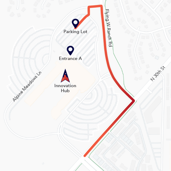 For Direct Access into the Innovation Hub (VT-ARC): Please follow the signs for VT-ARC. If you are heading N on 30th, turn left at Flying W Ranch Road, take the second left into the 2424 property (West Entry/West Visitor Parking) Alpine Meadows Ln. Take the immediate left that points towards “Innovation Hub” Building A. We will be the first parking lot on your right. Look for car chargers near building entry.