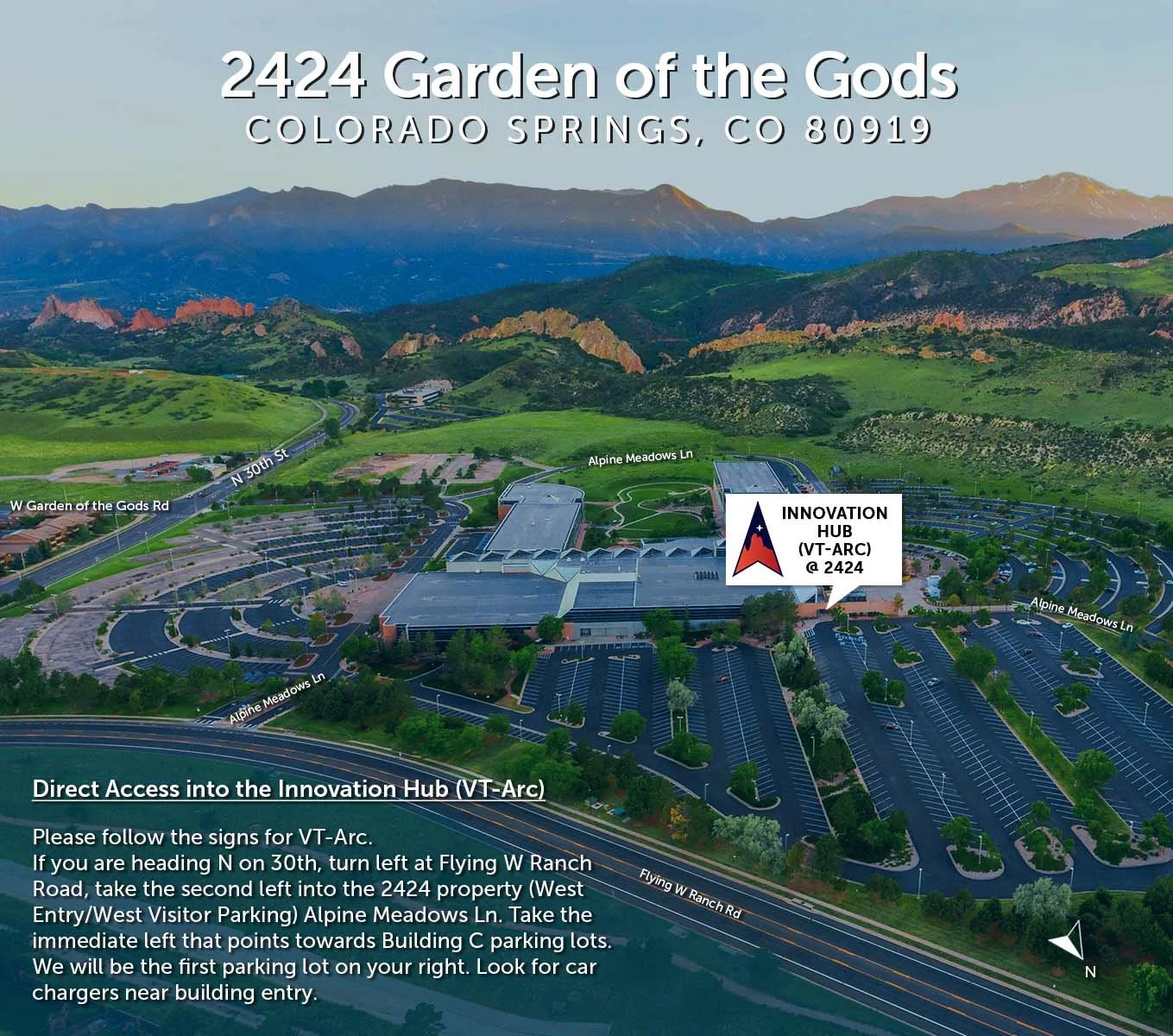 For Direct Access into the Innovation Hub (VT-ARC): Please follow the signs for VT-ARC toward the Northside of the building. If you are heading N on 30th, turn left at Flying W Ranch Road, take the second left into the 2424 property (West Entry/West Visitor Parking) Alpine Meadows Ln. Take the immediate left that points towards Building C parking lots. We will be the first parking lot on your right. Look for car chargers near building entry.